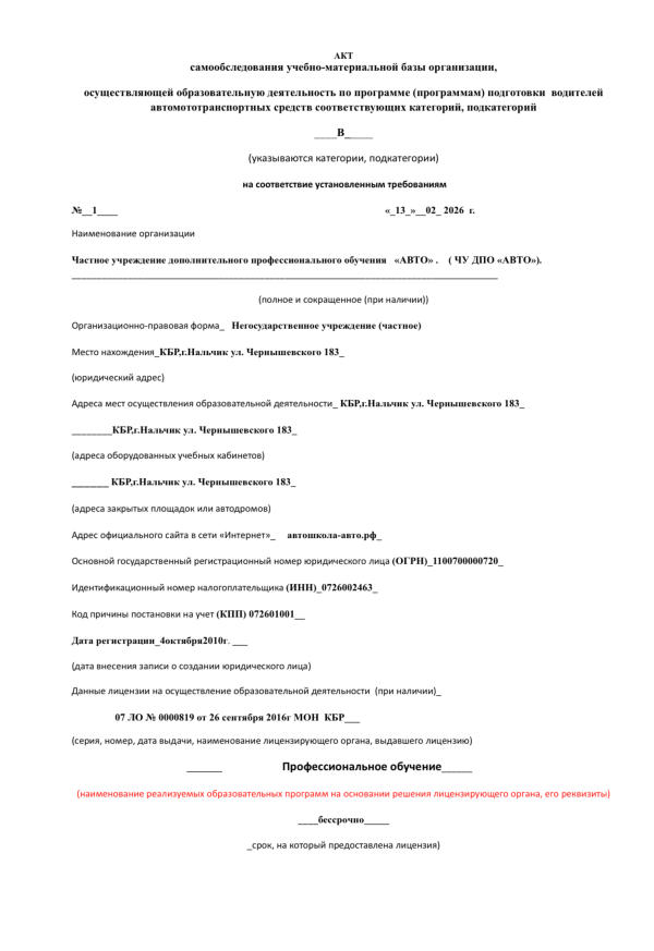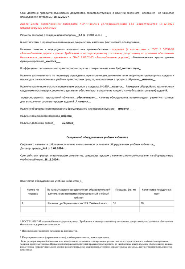 В 2020г. ГИБДД КБР провела в ЧУ ДПО «АВТО» очередное обследование и выдало Заключение № 07-27/20 от 26.05.2020г о соответствии нашей учебно-материальной базы установленным требованиям по профессиональному обучению водителей транспортных средств категории «В», со сроком действия данного Заключения до 25.05.2025г.